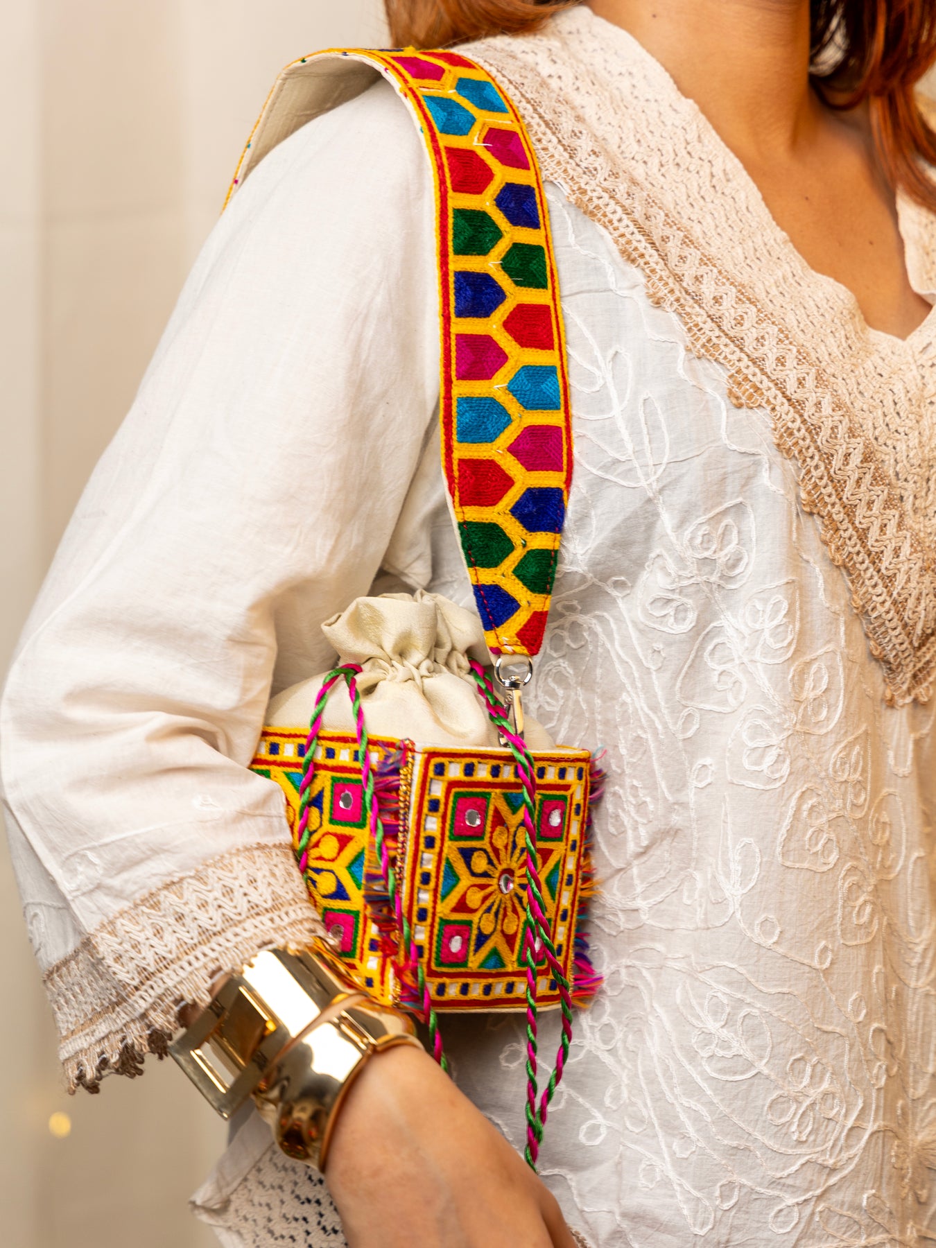 Step onto the festive stage with the Mandala Potli – a bold blend of geometry and tradition. Designed in a unique cube silhouette with a soft potli drawstring top, it’s adorned with vivid Kutch embroidery, an embroidered multicolor handle, and playful tassels that sway with every move.