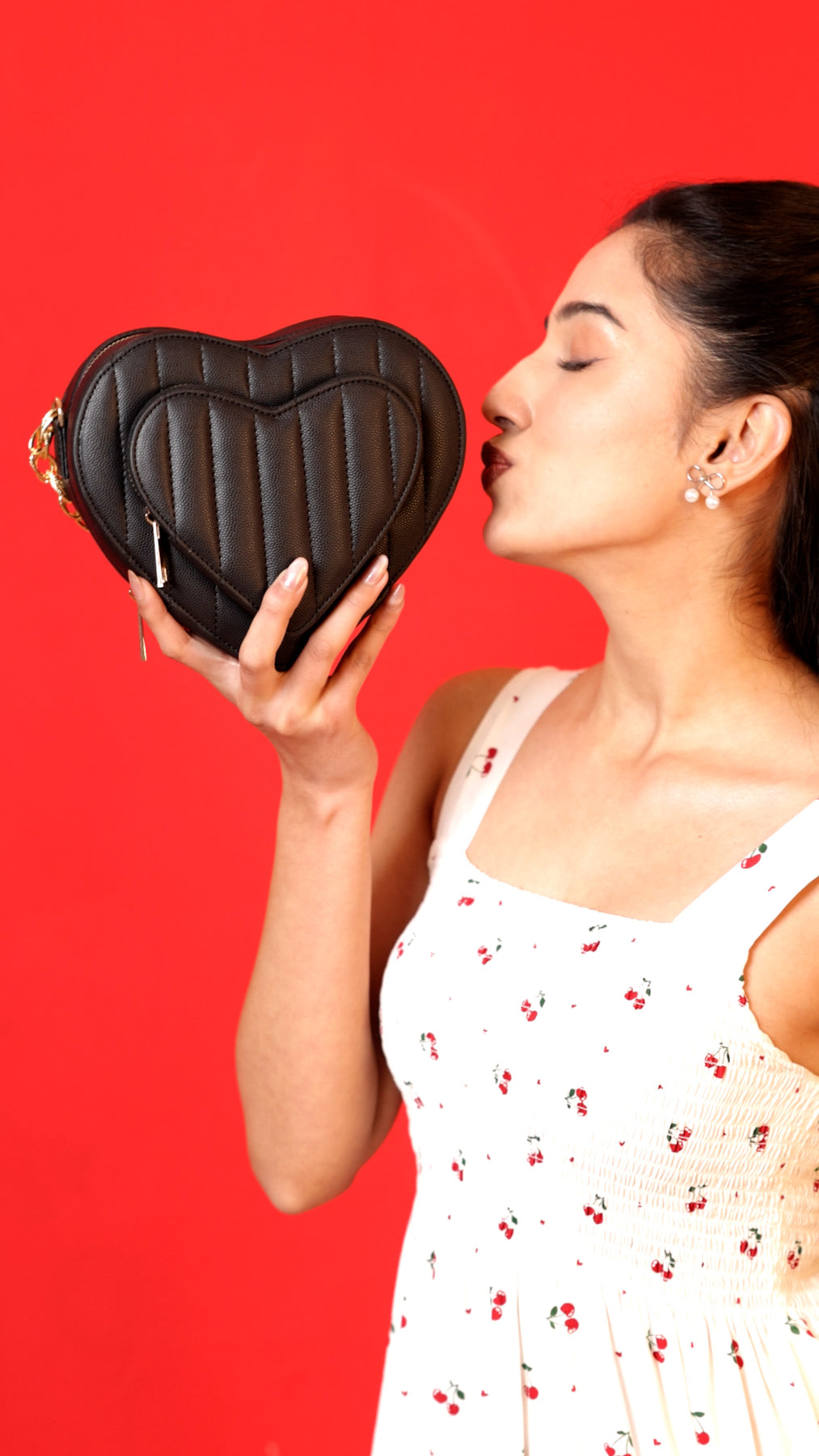 Finished with refined gold-tone hardware, it comes with a stylish short chain handle for dressy moments and a detachable long vegan-leather sling for hands-free versatility. Whether it’s a date night or a festive outing, this bag brings together romance, functionality, and conscious fashion in one lovable design. 💕