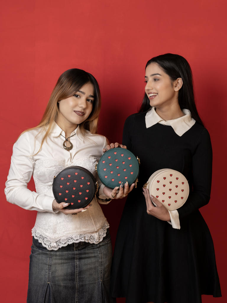 The Love Pop Circle sling bag is a charming Valentine’s statement piece designed to steal hearts. Crafted in premium vegan leather, this perfectly round silhouette features delicate laser-cut heart motifs that add a playful yet elegant touch. The structured form keeps it stylish and compact, making it ideal for day dates or romantic evenings.